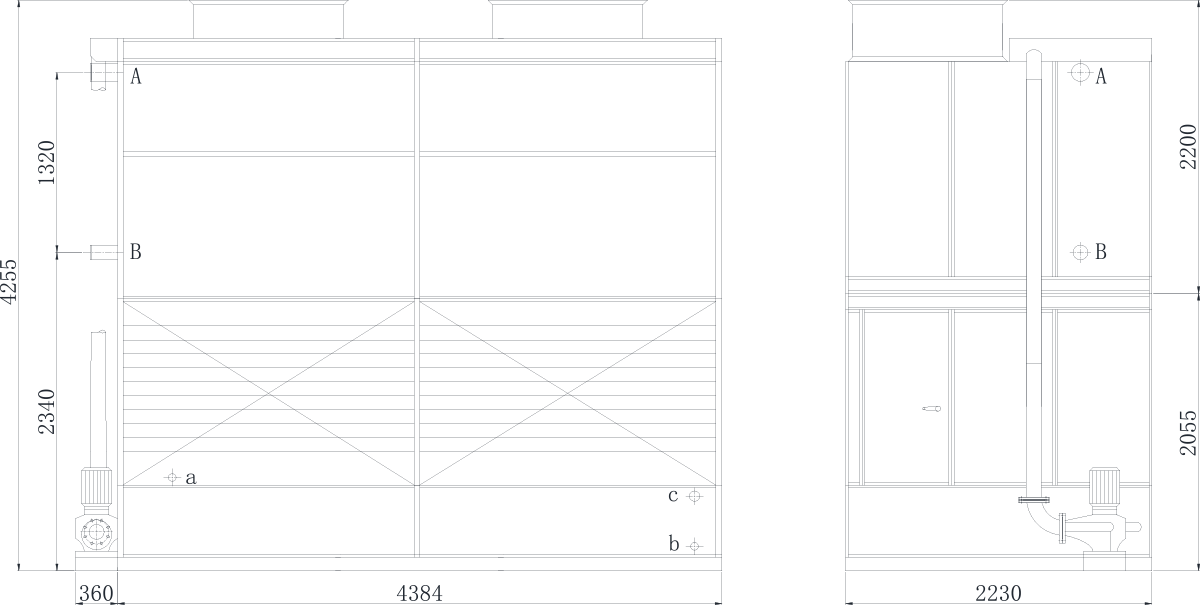 After absorbing the heat of refrigerant medium, some water turns into steam and is discharged by propeller fan. Meanwhile, the moisture in the air is collected by dehydrator to collecting basin, and then the non-gasified cooling water flows into heat exchange layer and its heat is taken away by the airflow. The cooled water converges in the basin to be used circularly by the pump later. In addition, there is a float valve in the basin. When the water is consumed to a certain point, the float valve will automatically open to replenish the cooling water.